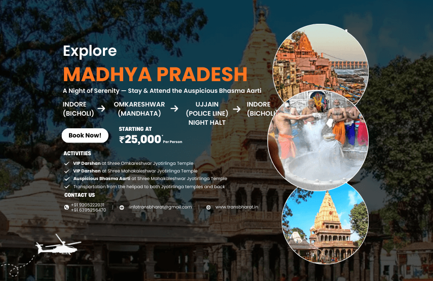 - Helicopter journey covering two Jyotirlingas — Shree Omkareshwar & Shree Mahakaleshwar — in just 2 days.